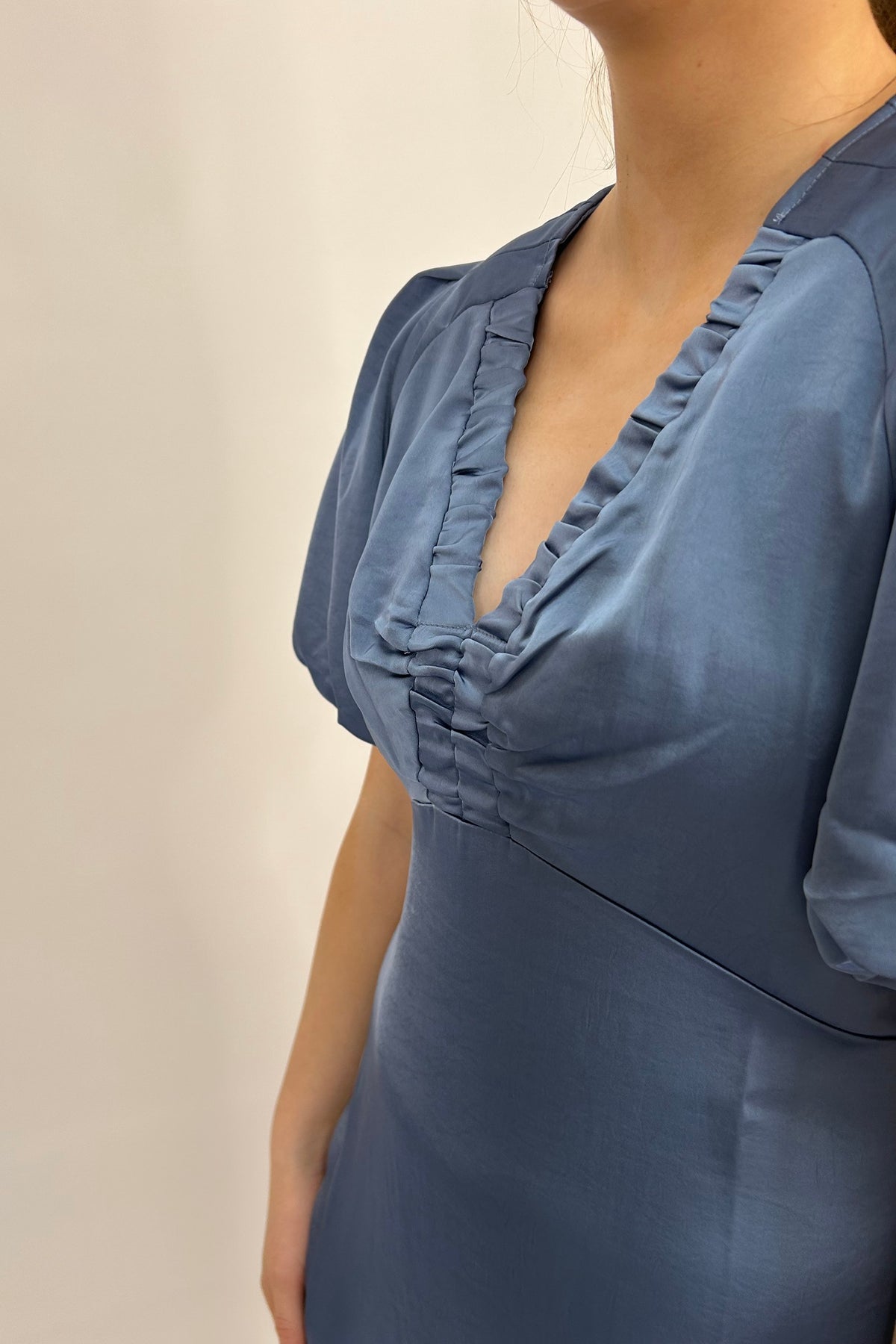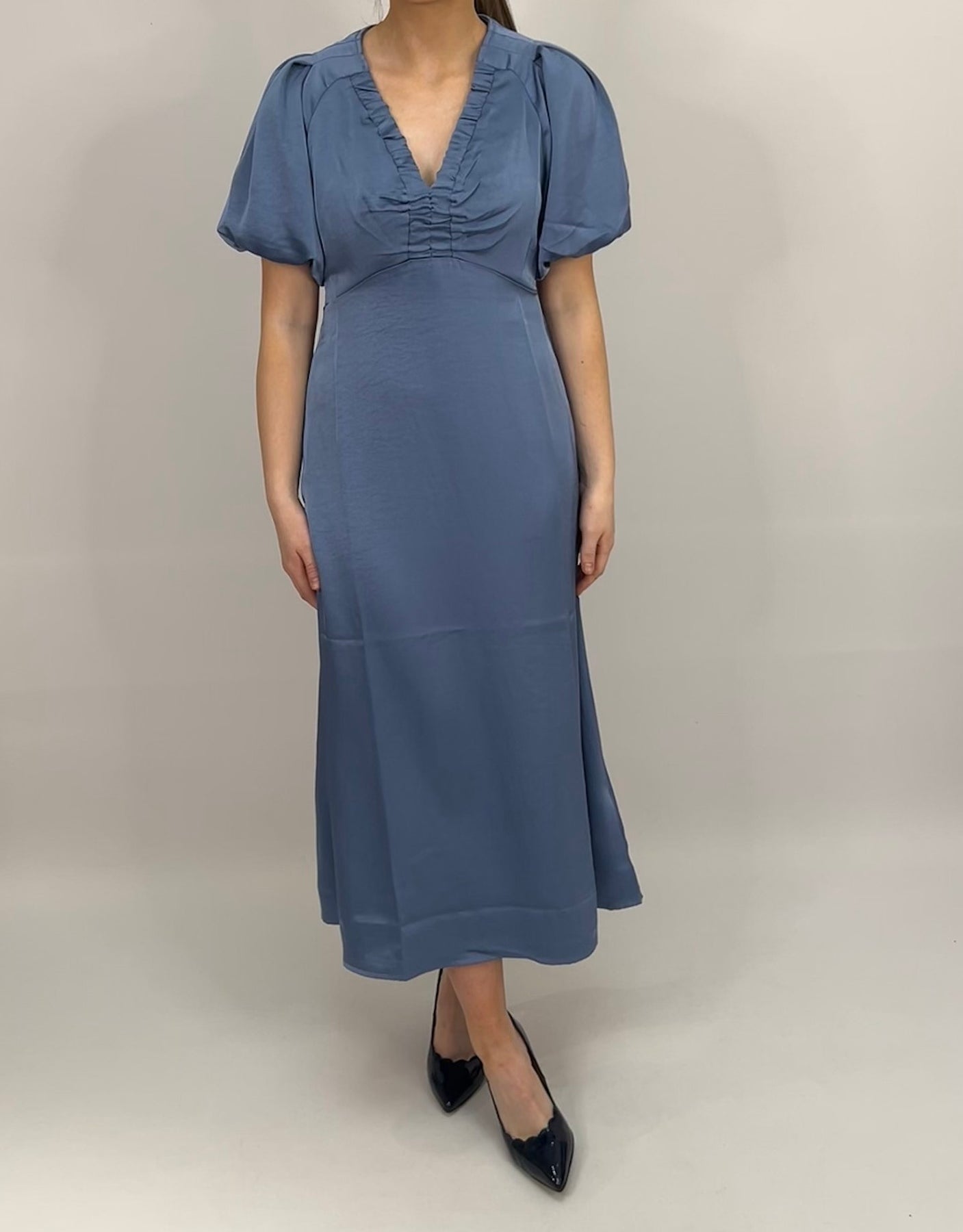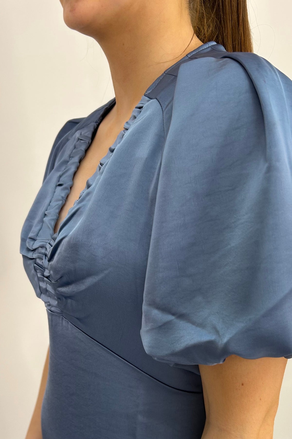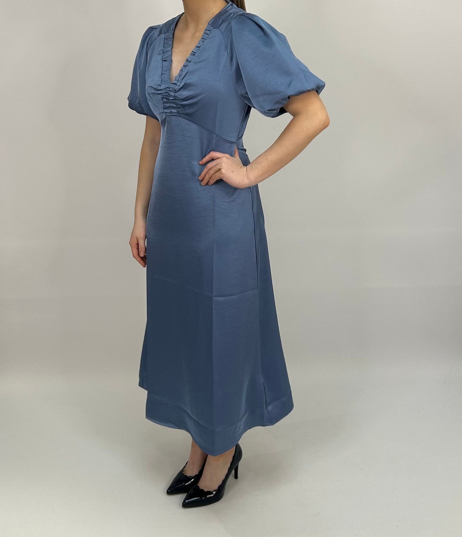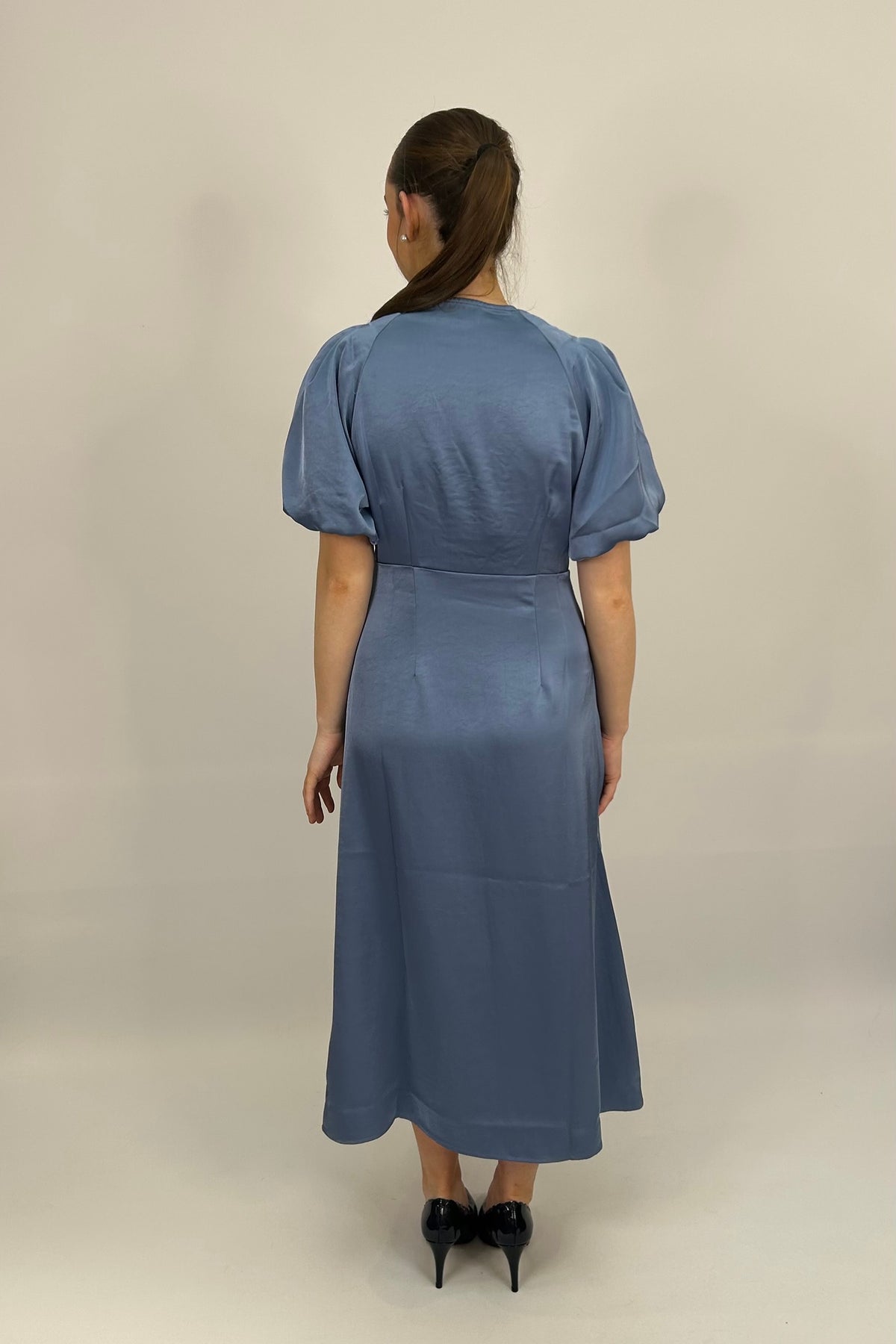 Regular price £79.95This is a beautiful blue dress. This is perfect for any occasion from a wedding to a formal dinner. This dress feature a V-neckline, a slight puff sleeve, a silk like style and a regular fit.