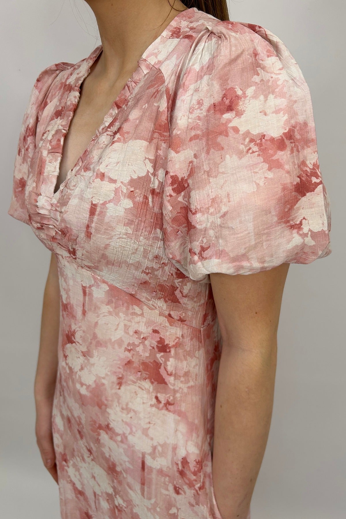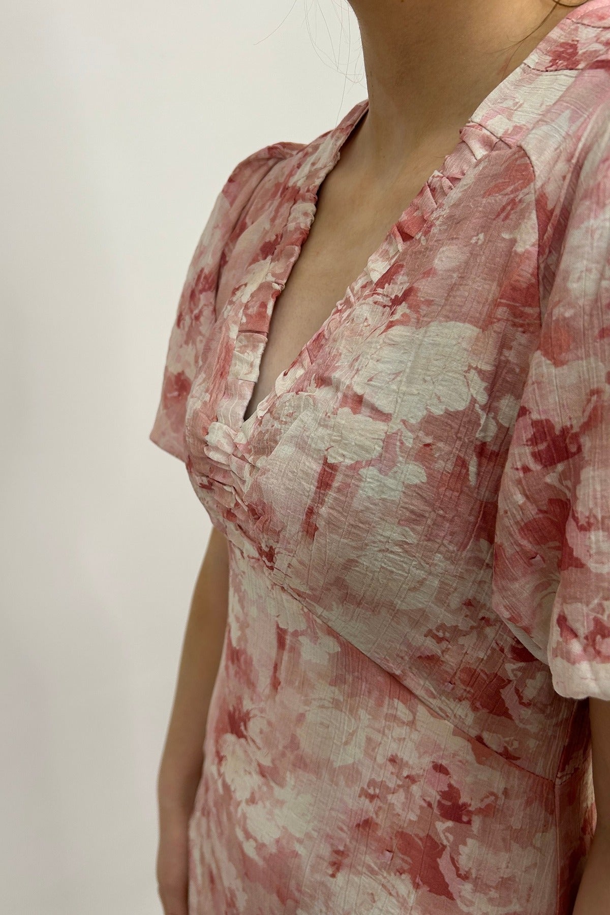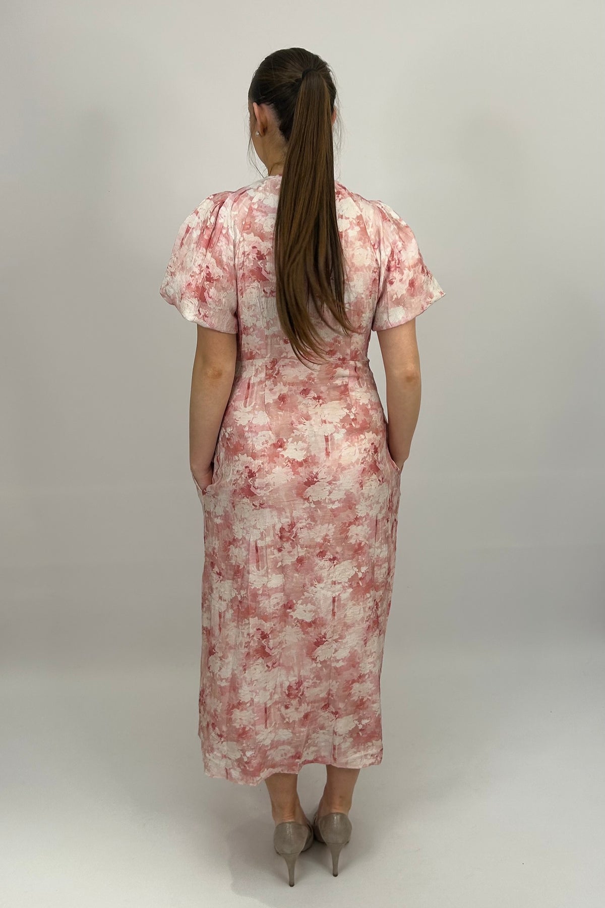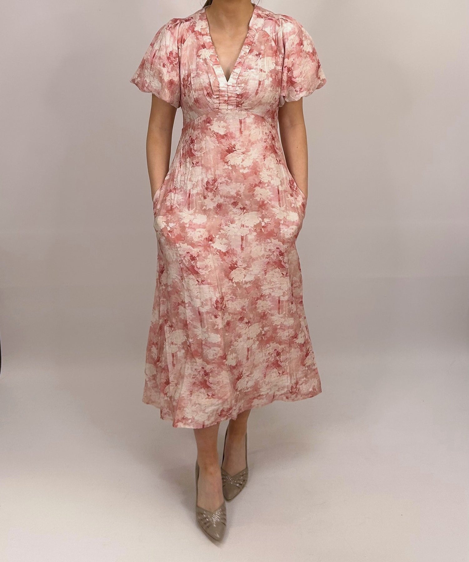 Regular price £79.95This is a gorgeous pink Neo Noir dress with this lovely pattern throughout the dress. This is perfect for any occasion from a weeding to formal dinner or if you are looking for a nice summer dress. This dress has a slight puff sleeve, pockets on both sides, V-neck line and is a regular fit.
