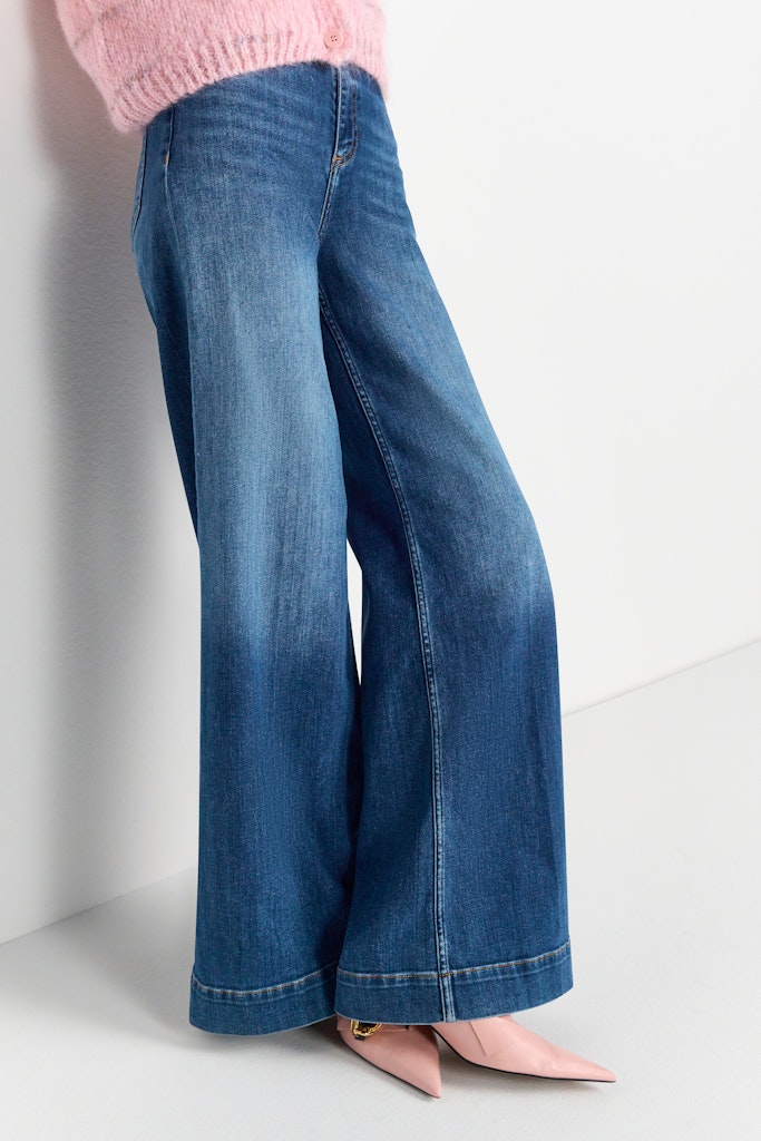 Regular price £149.95These elegant wide-leg jeans with a subtle wash and high waist create endlessly long legs! The flared cut and classic 5-pocket design give your look a modern retro touch! These jeans feature a wide leg shape, figure hugging fit, soft to the touch and zipper and button to fasten.
