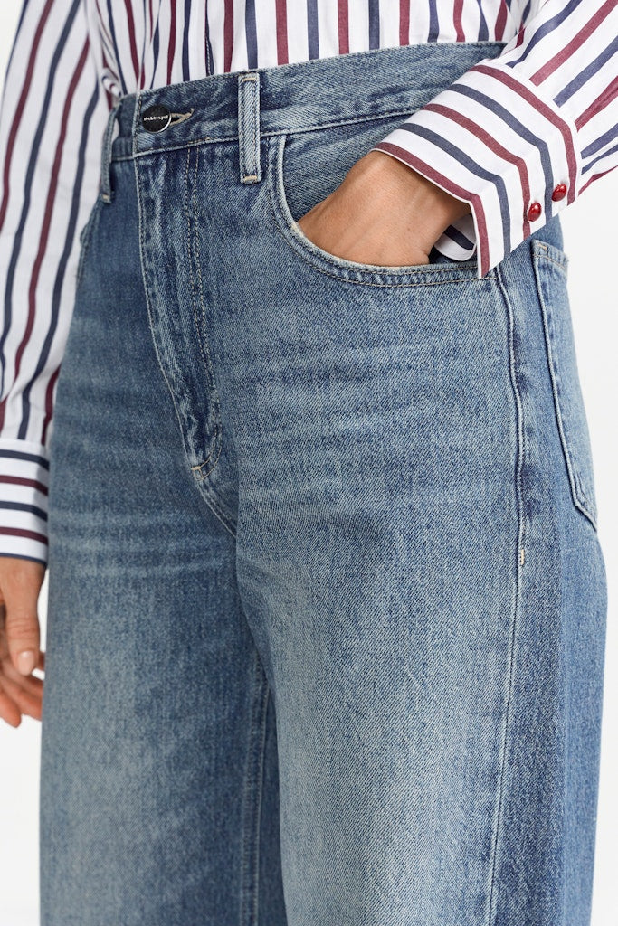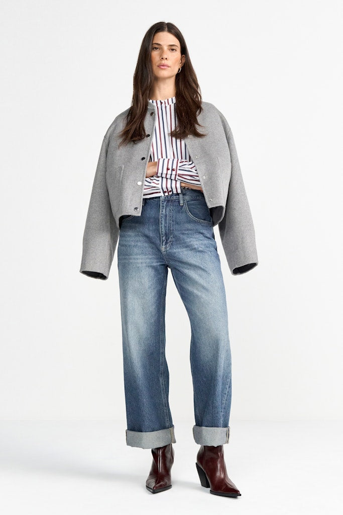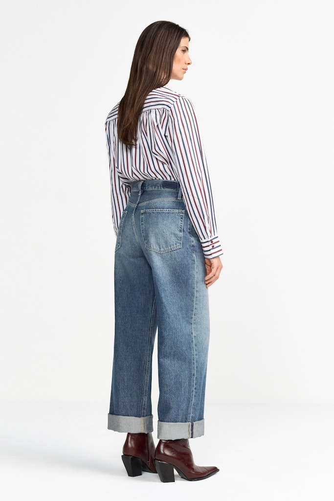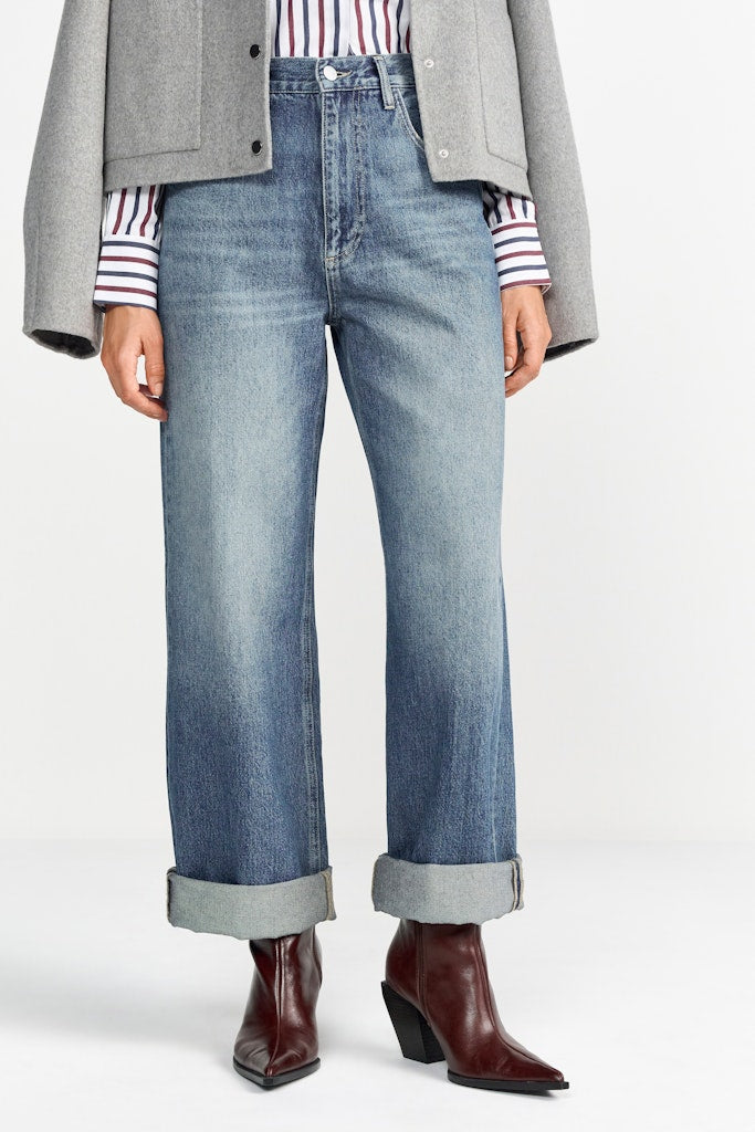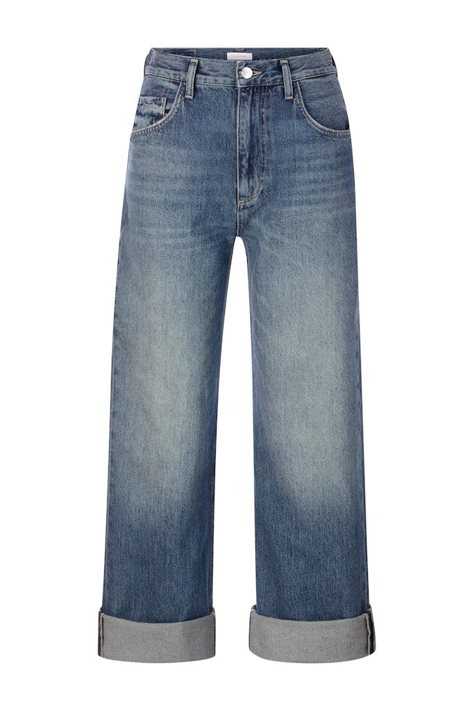 Regular price £149.95These jeans in a classic denim look with a high waist and light used wash will be a stylish highlight for your casual outfits thanks to their straight cut and wide turn-ups! These jeans feature a baggy fit, 5 pockets and a turned up hem.