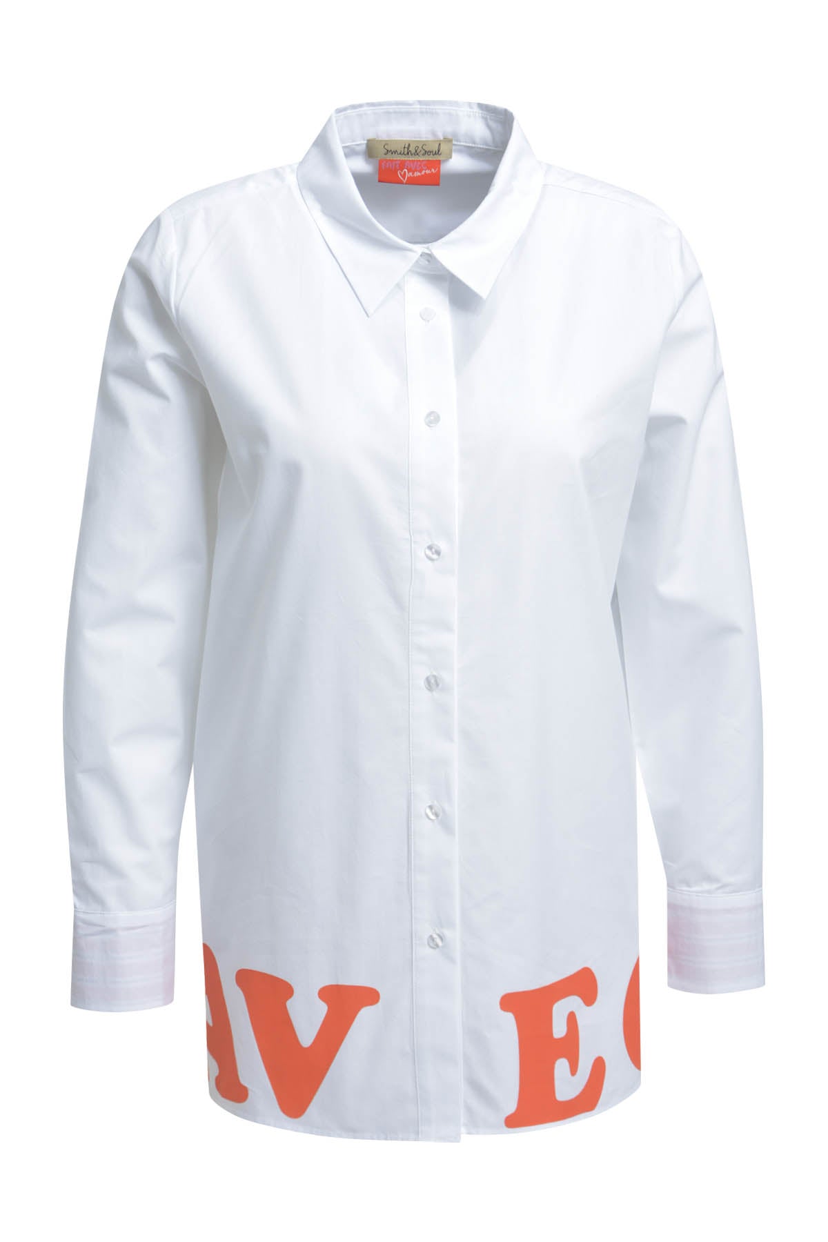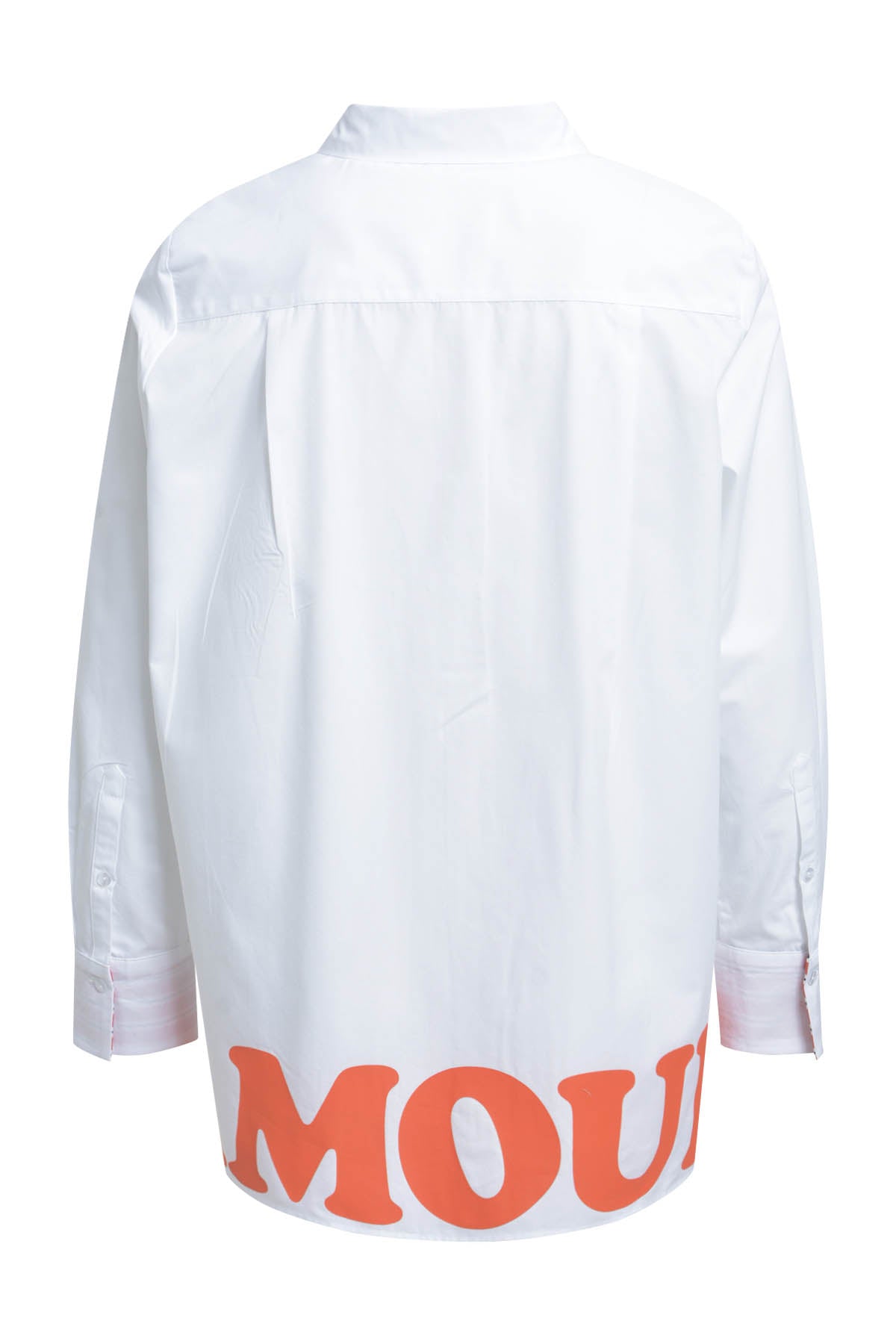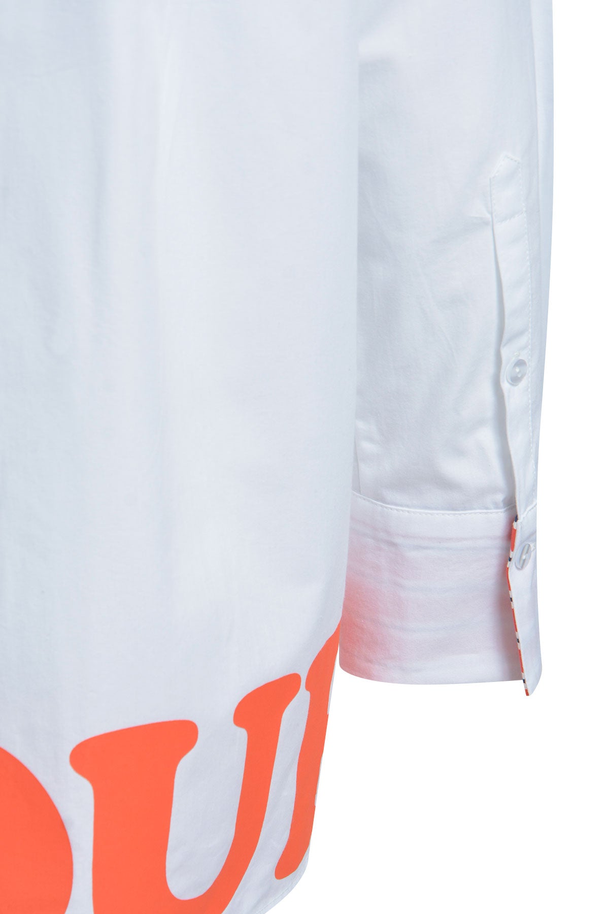 Regular price £96.00This is a stunning white shirt with writing around the bottom, if you turn the cuff up it will reveal a orange striped detail. This shirt features a standard collar, long sleeves, buttons to fasten and boxy shape.